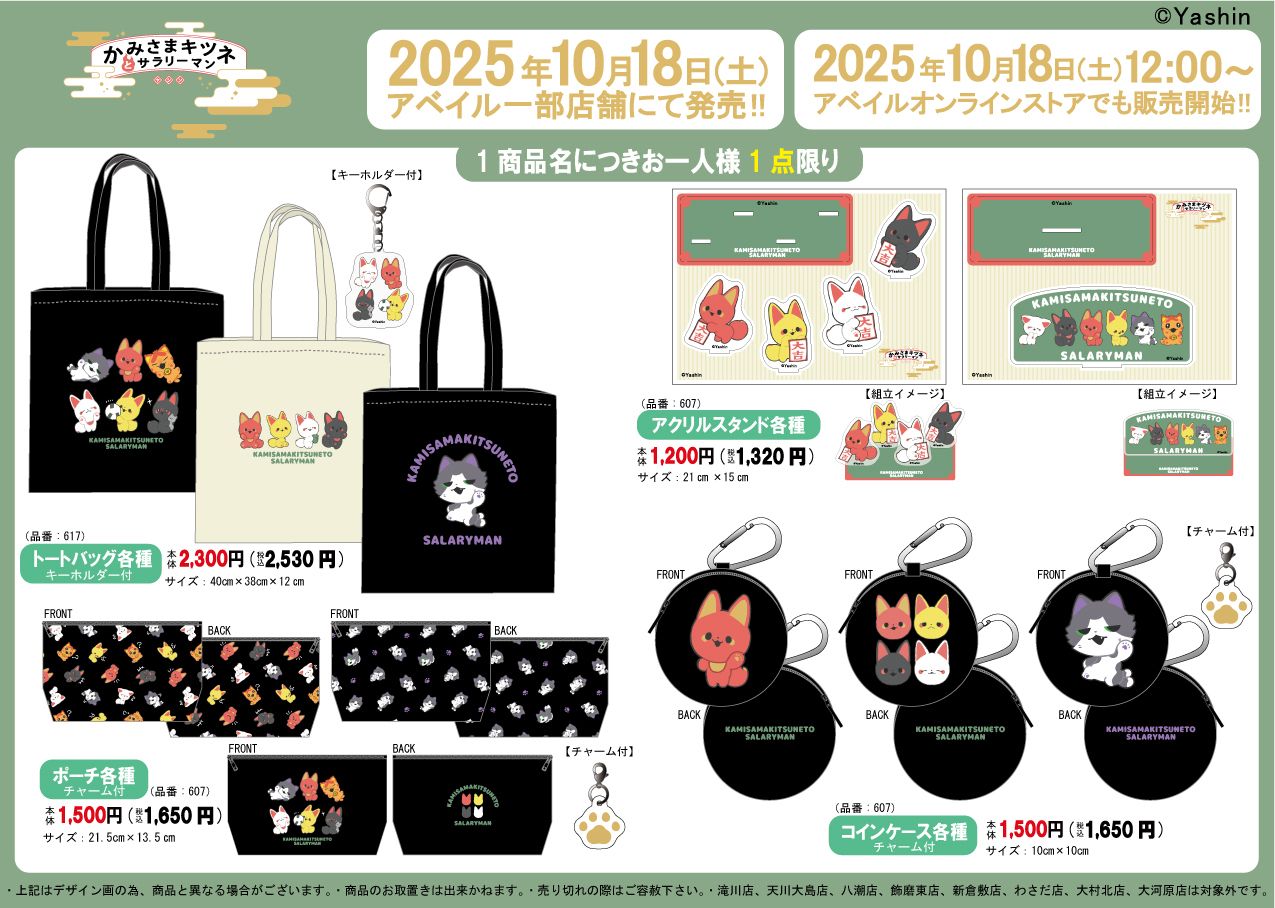 しまむら系列アベイルでは『かみさまキツネとサラリーマン』コラボを2025年10月18日(土)~発売します。トレーナー、トートバッグ、アクスタ、コインケース、ポーチがラインナップ!