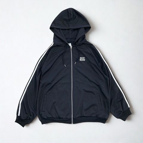 胸元には「BEST BUDS」のロゴ刺しゅうをシンプルに配置し、カジュアルながら存在感のある一枚に。