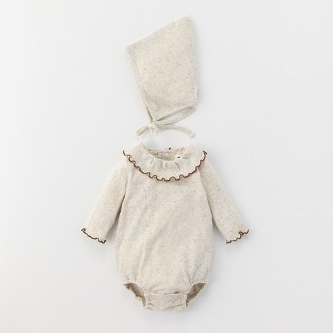カラーネップのはいったテレコ素材を使用したロンパスとボンネットの2点セットアイテムです。