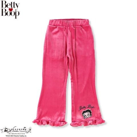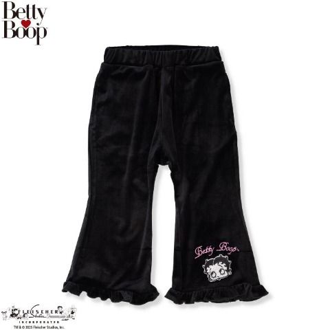 裾のフリルとBETTYBOOP(TM)刺しゅうがかわいいベロアのベルボトムパンツです。