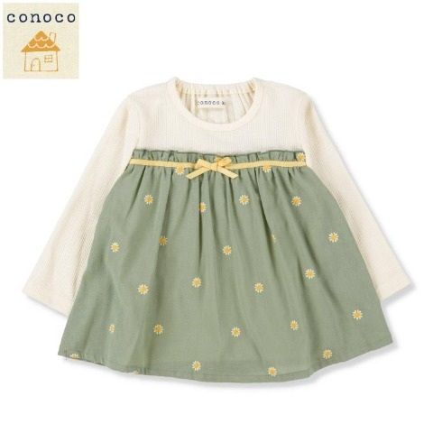 長袖部分は、伸縮性抜群のテレコ素材を使用し、活発に動くお子様の動作を妨げず、快適な着心地をキープします。胸もと切り替えから広がる布帛部分は、サラリとした平織り生地に愛らしいデイジー刺しゅうを贅沢にあしらい、上品な華やかさを演出。