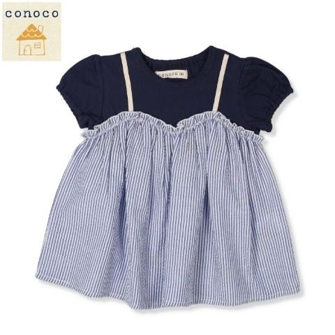 身頃にはソフトな肌触りの天竺素材、重ね着風のパーツには涼しげな先染サッカーストライプを使用しました。細めの肩紐がアクセントになり、少し背伸びをしたようなお姉さんらしい雰囲気を演出します。