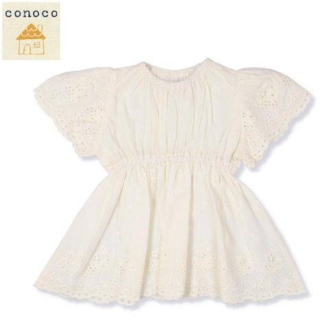 生地そのものに施された美しい刺しゅうと、裾のスカラップデザインが、夏の日差しに映える上品な華やかさを演出します。ウエストのギャザーからふんわりと広がるシルエットと、ゆったりとした袖のデザインで、通気性も良く軽やかな着心地。