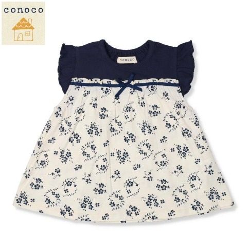 スカート部分には、独特の風合いがあるスラブ天竺の単色花柄を使用。落ち着いたトーンの花柄が、甘くなりすぎず清楚な印象を与えてくれます。胸元の小さなリボンと袖のフリルが、お子さまの愛らしさをより一層引き立てるデザインです。