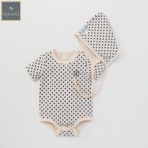 オーガニックコットンを使用した半袖ロンパスとボンネットのセットアイテムです。
