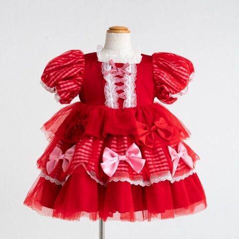 ギンガムチェックに編み上げレースやたくさんのリボンがついたボリュームのあるデザインがとってもかわいいです。