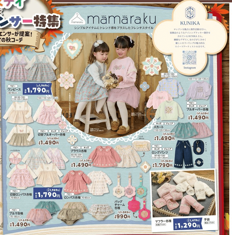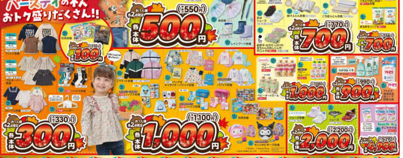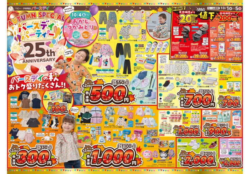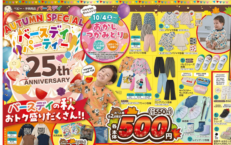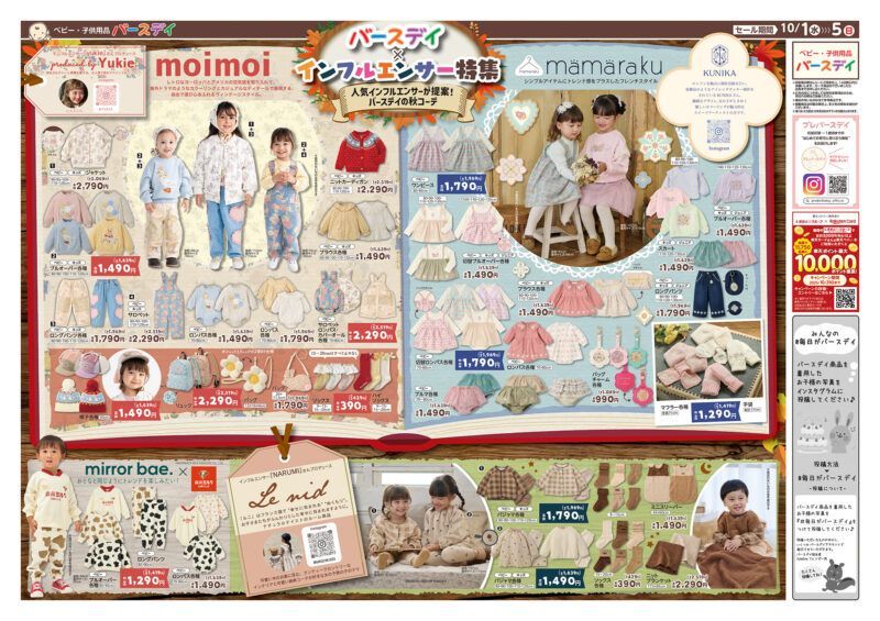 バースデイ チラシ速報2025年10月1日~moi moi(モイモイ)、森永乳業×mirror bae(ミラー ベイ)、mamaraku(ママラク)、Le nid(ルニ)の秋冬の洋服が新発売!25周年企画でセールも実施!