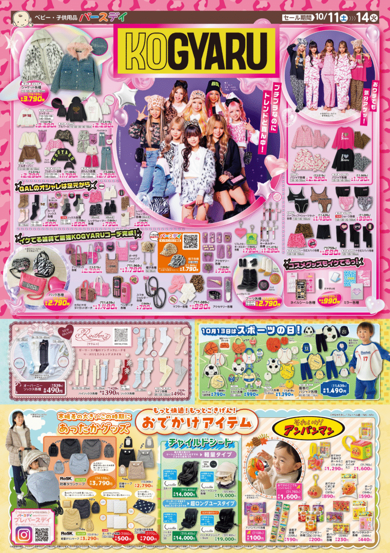 バースデイ チラシ速報2025年10月11日~KOGYARU(コギャル)冬の大型コラボが新発売!スポーツモチーフのベビー服や雑貨、防寒ケープのおでかけアイテムも!