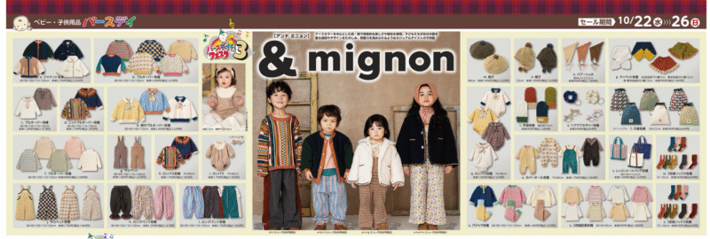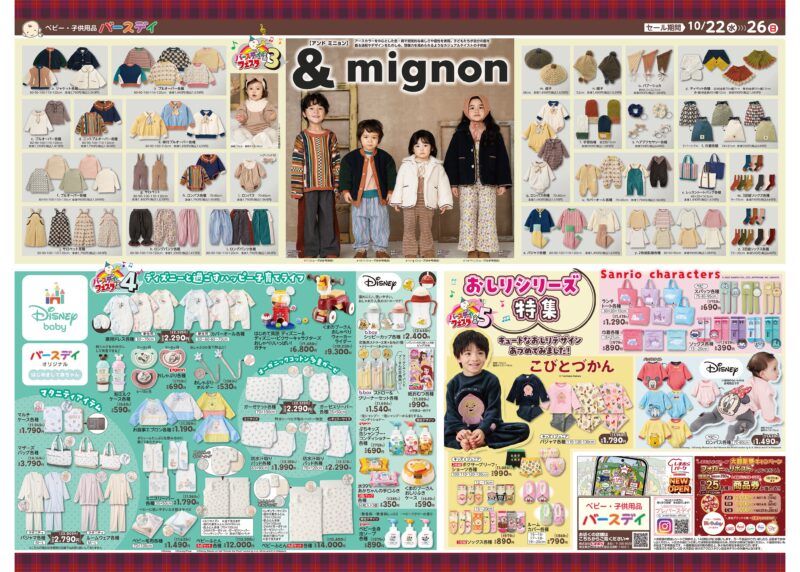 バースデイ チラシ速報2025年10月22日~大創業祭!バースデイフェスタで日替わりのセール商品が販売!&mignon(アンドミニョン)冬の洋服、ディズニーのベビーアイテムも!