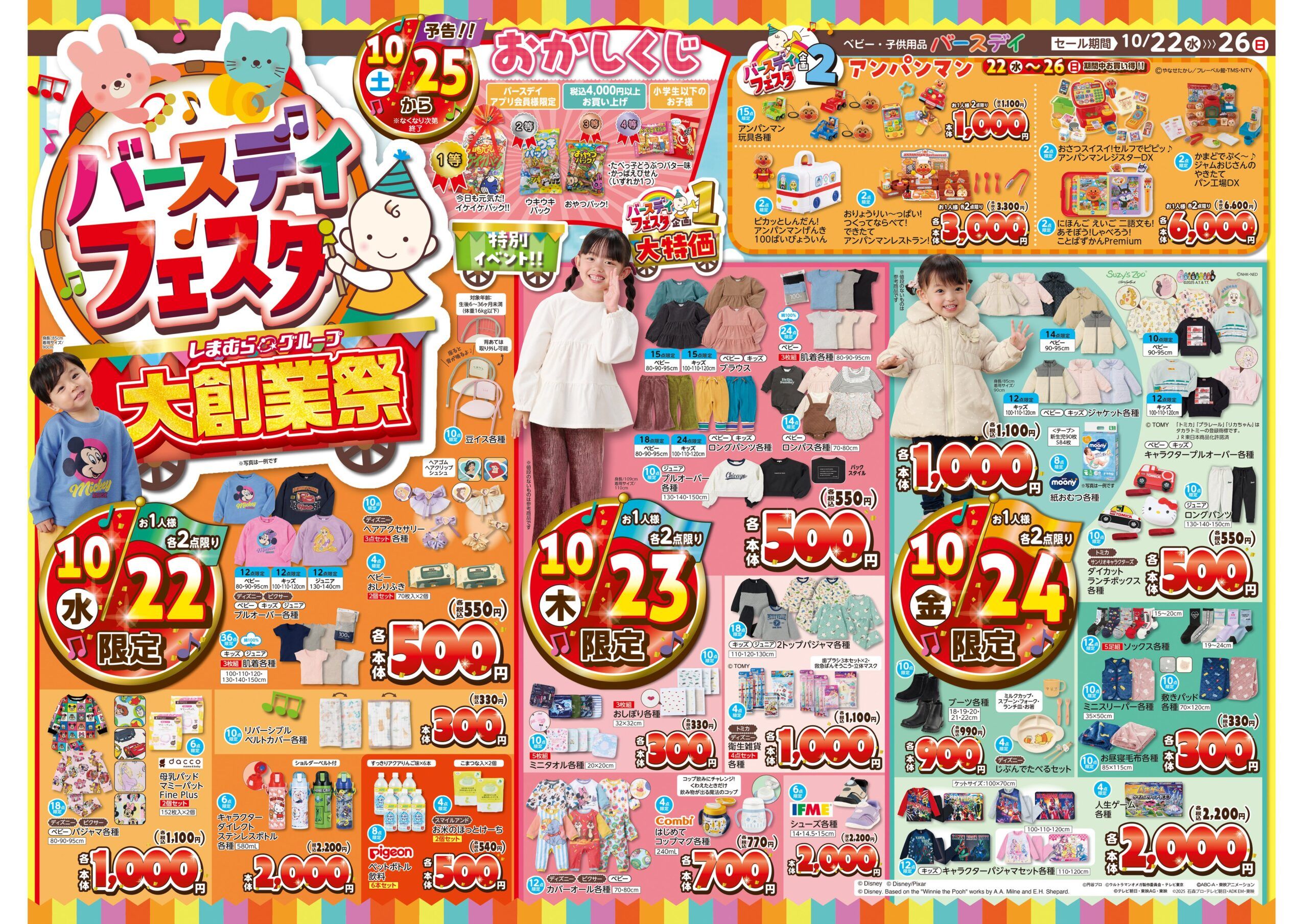 バースデイ チラシ速報2025年10月22日~大創業祭!バースデイフェスタで日替わりのセール商品が販売!&mignon(アンドミニョン)冬の洋服、ディズニーのベビーアイテムも!