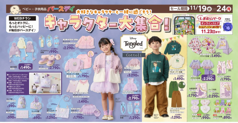 バースデイ チラシ速報2025年11月19日~ラプンツェル、サンリオの冬アパレルや雑貨が新発売!アンパンマンのおもちゃもクリスマスにオススメ!