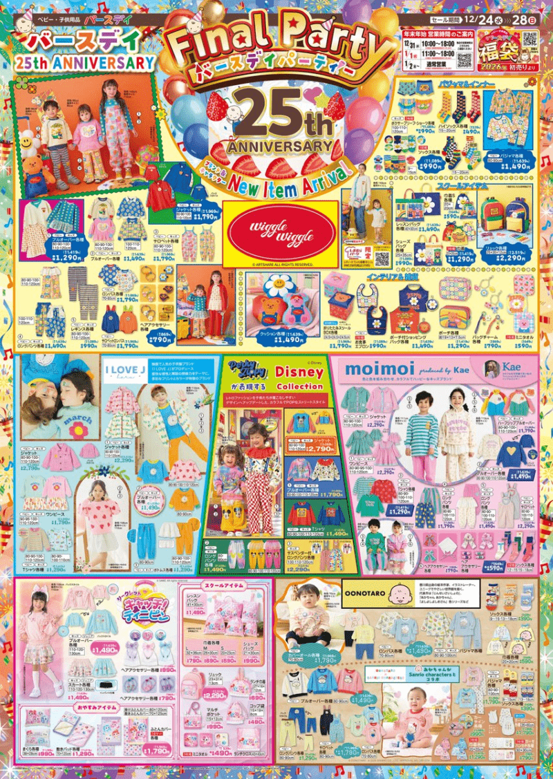 バースデイ チラシ速報2025年12月24日~wiggle wiggle、ティニピン、Perky Zippy、レトロミッキー、おおのたろう、moi moiコラボの春の子供服が新発売!バースデイ25周年ファイナルパーティー!