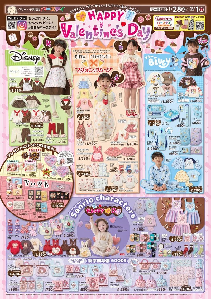 バースデイ チラシ速報2026年1月28日~ディズニー、サンリオのチョコレート&バレンタインをモチーフにした子供服や雑貨が新発売!マリオンクレープ、ブルーイ、ミニーマウスの春服も!