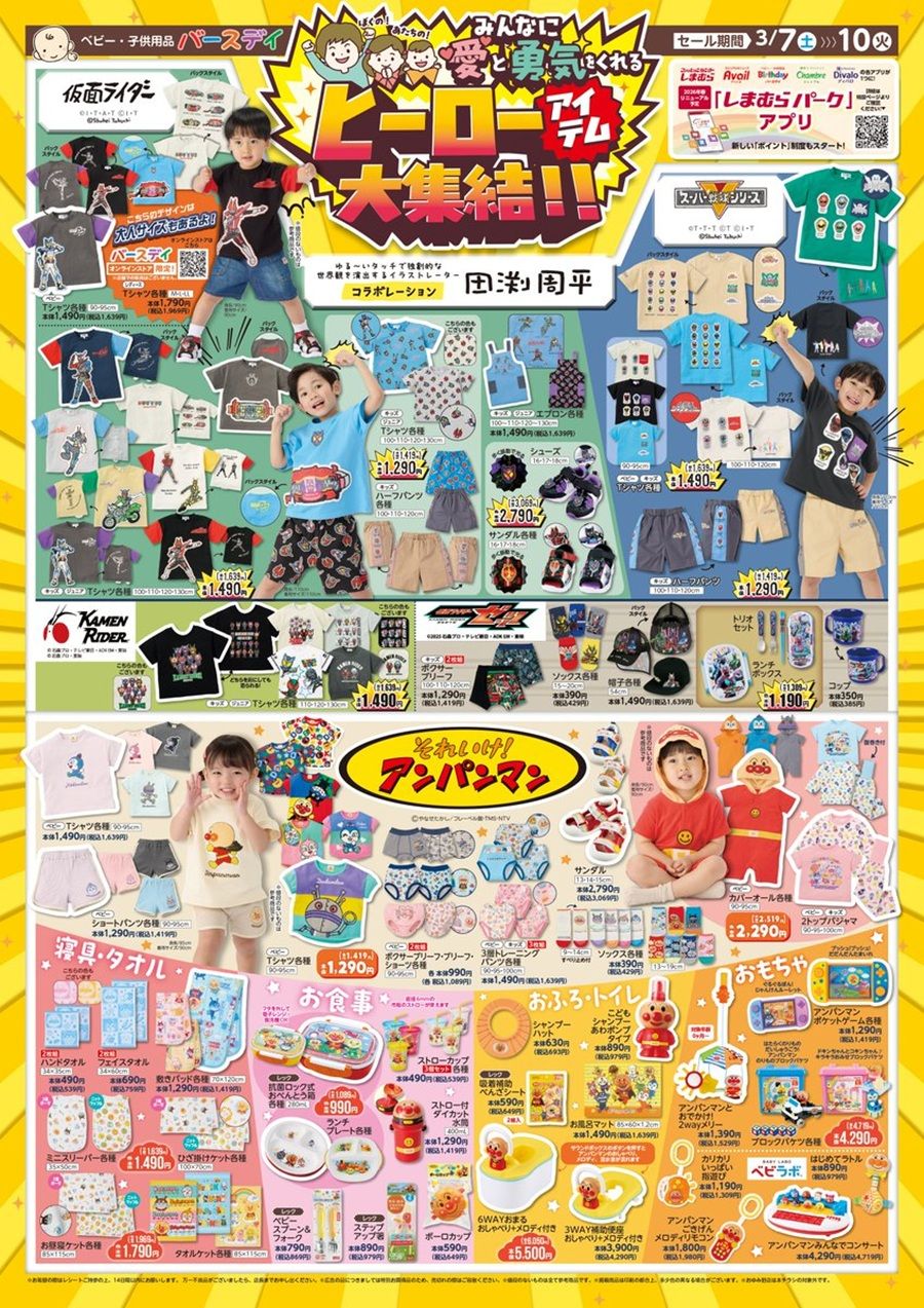 バースデイ チラシ速報2026年3月7日~ヒーローアイテム大集結!仮面ライダー、スーパー戦隊シリーズ、アンパンマンの春夏洋服が新発売!田渕周平コラボも!