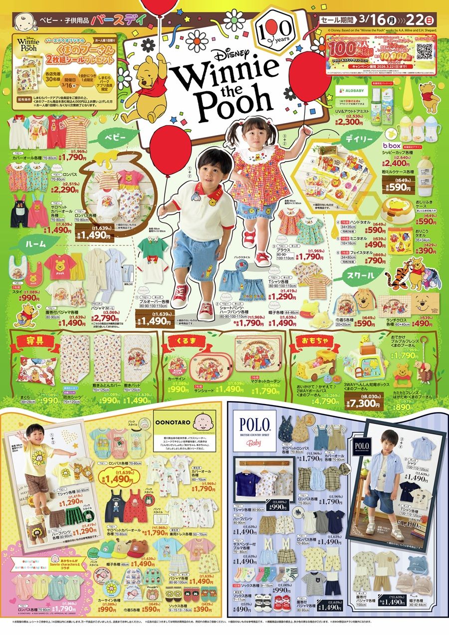 バースデイ チラシ速報2026年3月16日~くまのプーさん原作デビュー100周年記念、OONOTARO(おおのたろう)、POLO(ポロ)から夏の子供服が新発売!