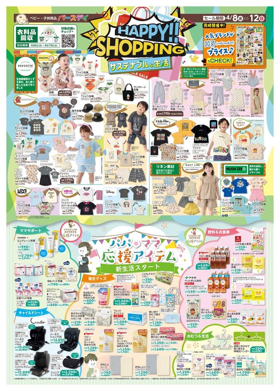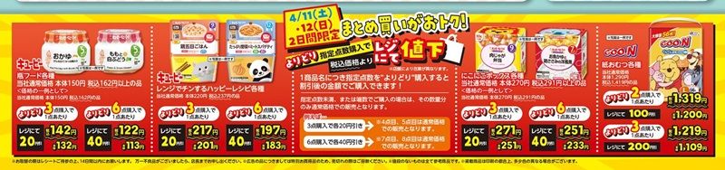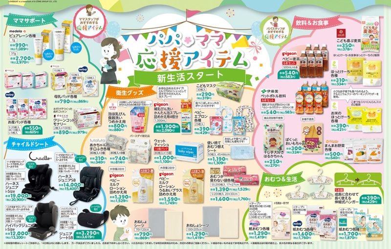 新生活のスタートに合わせて、子育てアイテムやベビーフードが広告の品で販売します。
