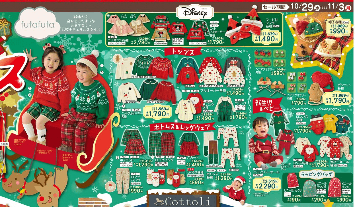 しまむら系列バースデイ『futafuta(フタフタ)』コラボの『クリスマス』アイテムも販売しています!10月末から11月初旬の水曜日頃に販売する傾向です!