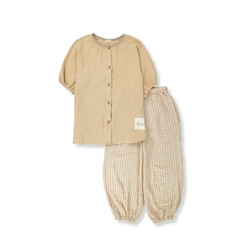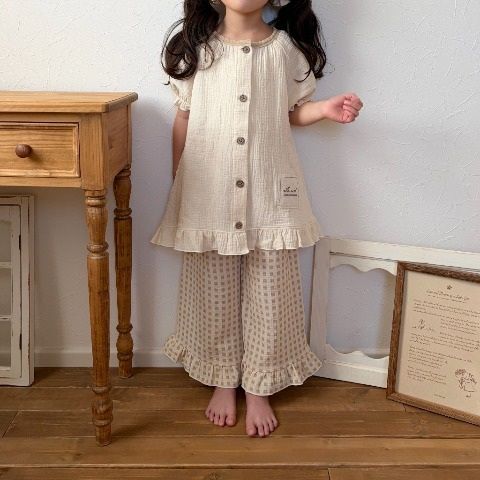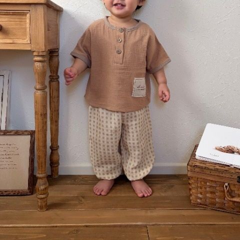 ドロップショルダーにゆったりめのシルエットのトップスにママとお揃いにもできる配色カラー、チェック柄のパンツです!