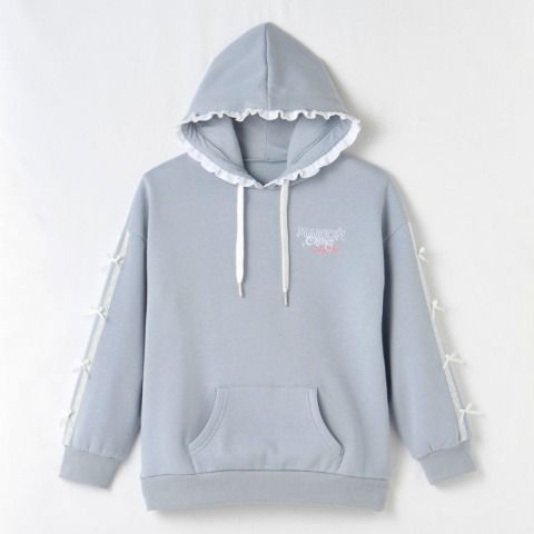 フードと袖にあしらったフリルレースがかわいいフーディーパーカー。