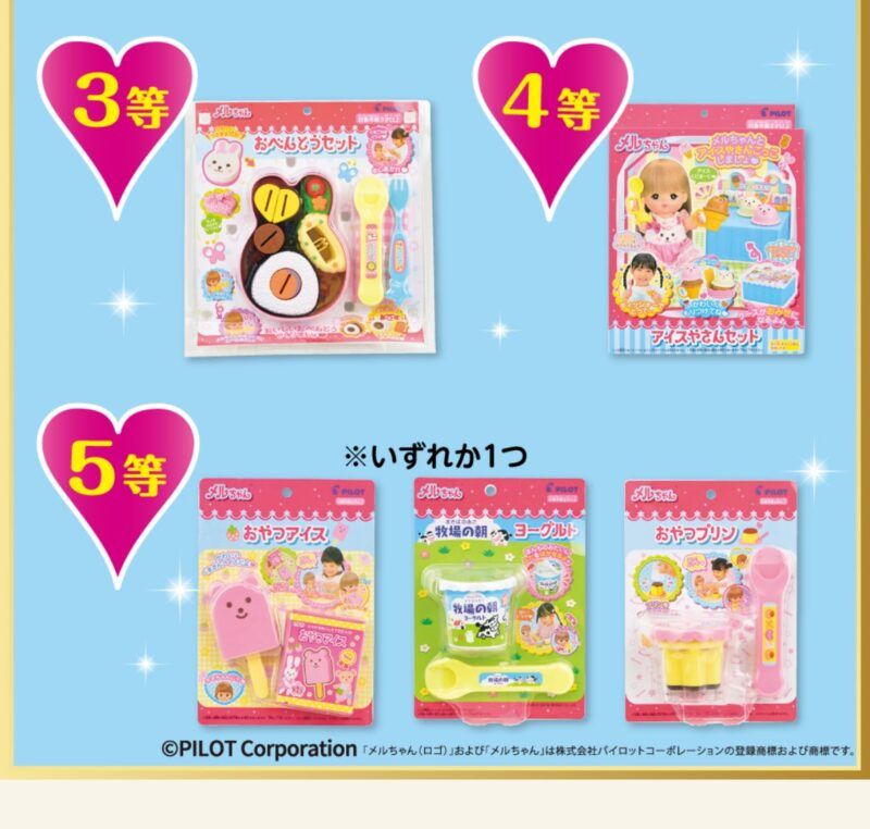 しまむら系列バースデイでは、『メルちゃんくじ』を販売します。お得な価格なのにたっぷりおもちゃがセットされていて大人気!