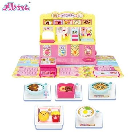 フードコートでおしょくじしましょ♪ たべものパーツをセットしてお花のボタンを押すと、たべものが下から出てきます! ボタンを押すとひきだしが出てくるレジつき。 たべものは、ぜんぶで5種類!カレーライス、うどん、たこやき、ハンバーガーにドーナツ!どれにしようかな? たべものは、裏返すと食べたように見えるギミック付き。