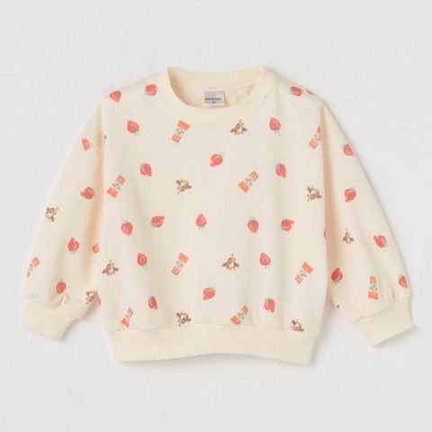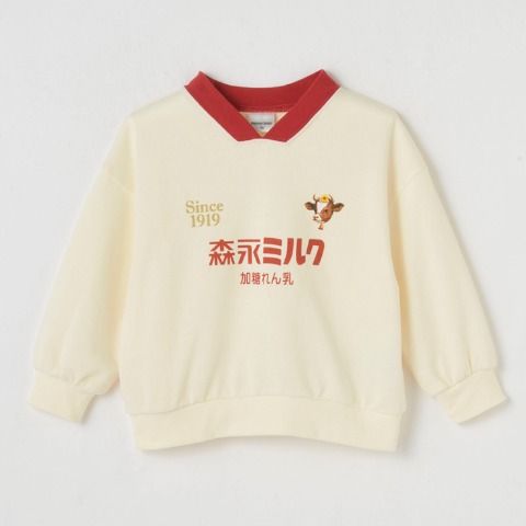 れん乳色の生地にれん乳から連想するものがプリントされてかわいい、綿混の裏毛素材を使用したトレーナーです。