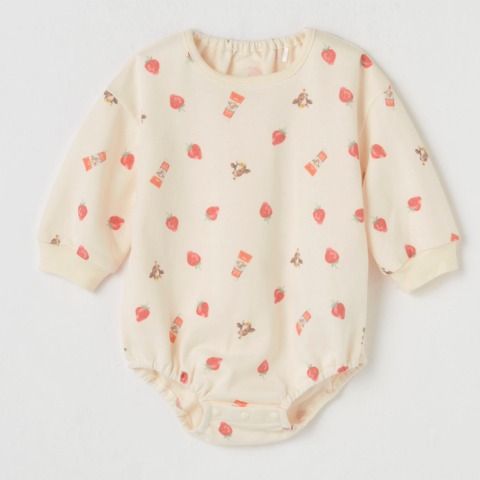 れん乳色の生地にれん乳から連想するものがプリントされてかわいい長袖ロンパースです。