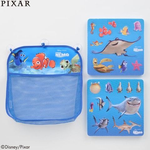 EVAブロックシートのキャラクター部分はダイカットにカットされていて飛び出す仕様、バスメッシュ収納には吸盤が付いていてお風呂の壁等にくっ付けることが出来る仕様になっています。
