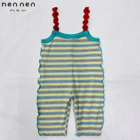 ポップなマルチカラーのボーダーが目を惹くテレコ素材のサロペット。