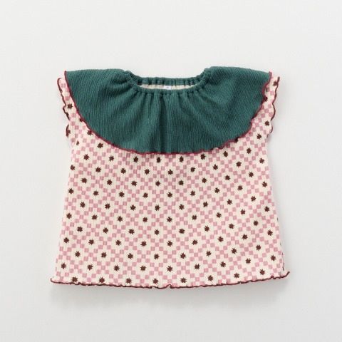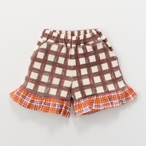 異なるチェック柄の組み合わせがポップなショート丈のワッフルフリルパンツです。