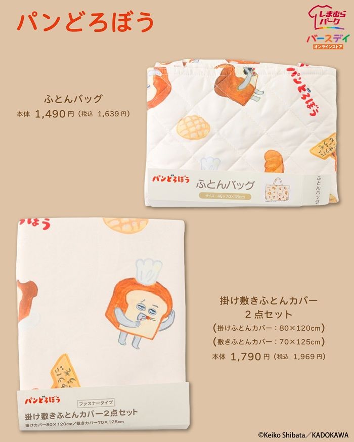 しまむら系列バースデイでは、『パンどろぼう』コラボのアパレルや雑貨グッズを販売しています。限定商品でファン必見です。