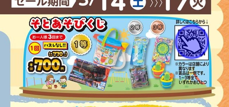 しまむら系列バースデイでは、『そとあそびくじ』を2026年3月14日(土)より販売します。価格は1回700円+税でおもちゃが当たります。上位には豪華景品も!