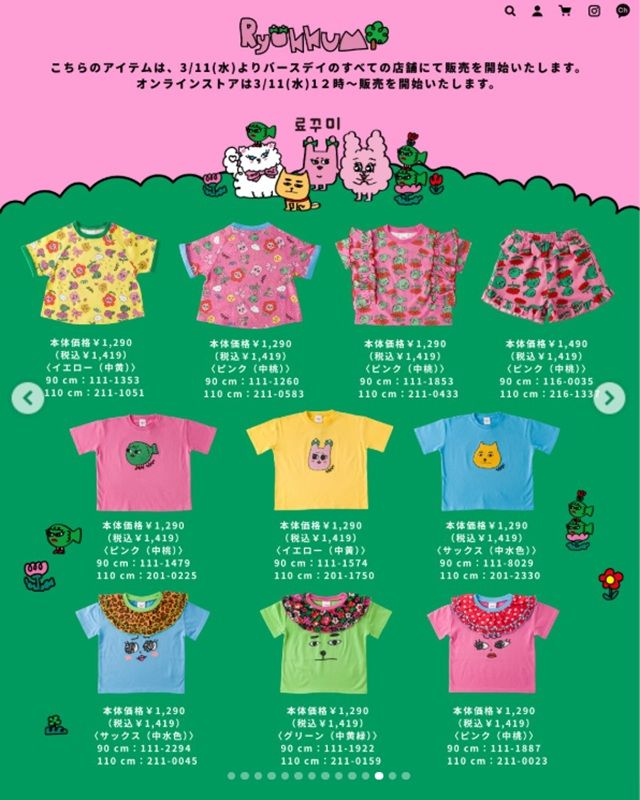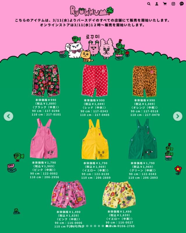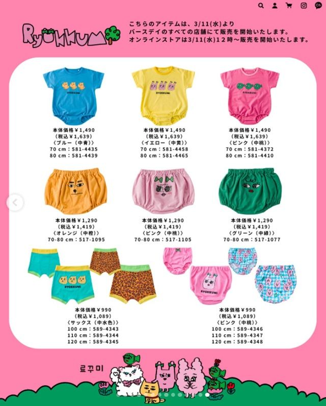 しまむら系列バースデイでは『RYOKKUMi(りょくみ @ryokkumi)』さんコラボを販売しています!ベビー、キッズサイズの子供服を展開!ポップなカラーとデザインの韓国っぽい子供服がラインナップ!