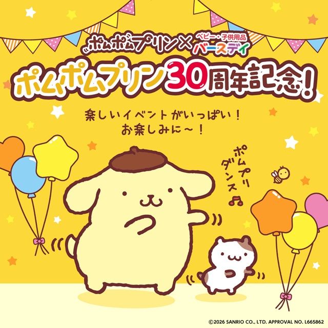 バースデイ『ポムポムプリン』コラボ!誕生日の特集が2026/4/11より新発売!品番、種類、販売方法まとめ!再販売は?30周年のアニバーサリーイヤー!