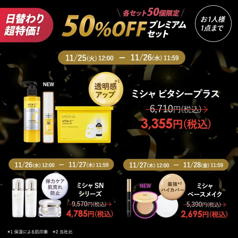 ミシャジャパン公式オンラインショップ本店にて最大80%OFFの「ブラックフライデーセール」を2025年11月25日(火)12:00から11月28日(金)11:59まで開催します!