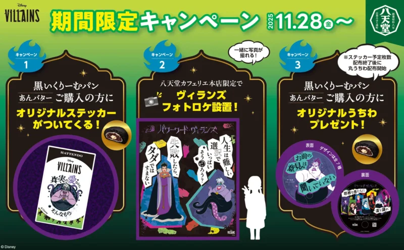 2025年11月28日(金)より、『ディズニーヴィランズ』デザインの「黒いくりーむパン あんバター」を全国の八天堂店舗(一部店舗を除く)で順次発売します。(11月28日(金)~千葉県・大阪府・広島県の八天堂店舗、12月1日(月)~東京都・静岡県・愛知県・大分県の八天堂店舗)