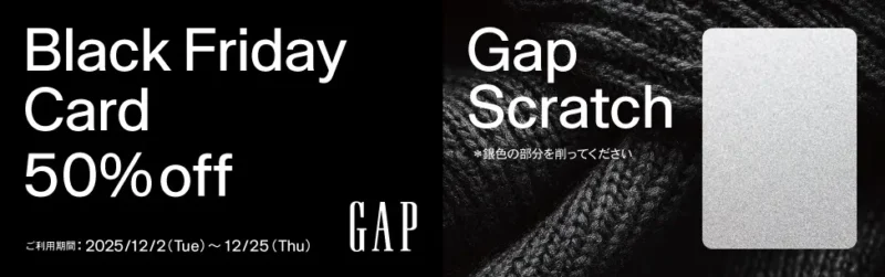 2025年11月20日(木)~12月1日(月)のブラックフライデー期間中、全国のGapストアと公式オンラインストア、Gap Outletストアでご購入されたお客様全員に、2025年12月2日(火)~12月25日(木)までのお買い物が50%OFFとなる「Black Friday Card」をプレゼントいたします。