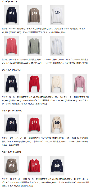 ベビーから大人まで、人気のGAPロゴスウェットやセーターなどが年に一度のスペシャルプライスに!