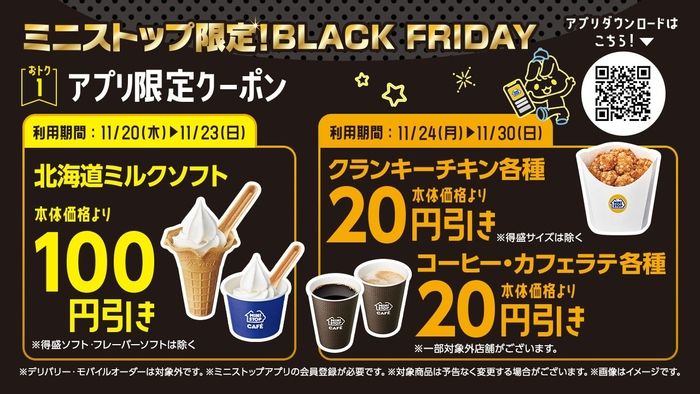 ミニストップは、2025年11月18日(火)より、「ブラックフライデー」を開催します。今年は、ブラックフライデーにちなんだ新商品を10種類発売!ミニストップアプリでは、「北海道ミルクソフト」「クランキーチキン各種」「カウンターコーヒー各種」の値引きクーポンを配信します。ブラックフライデー本番の11月28日(金)は、人気のアプリくじを実施します。