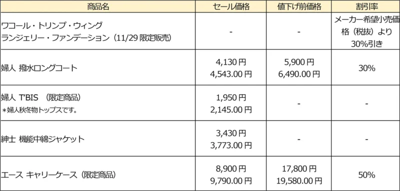 - 冬物衣料品、キャリーケース(限定品)を値下げ 年末年始のご旅行や冬の防寒にピッタリな商品をお買い得価格で提供します。