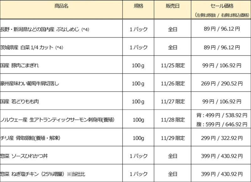 【西友の生鮮食品・惣菜の主なお買い得商品】