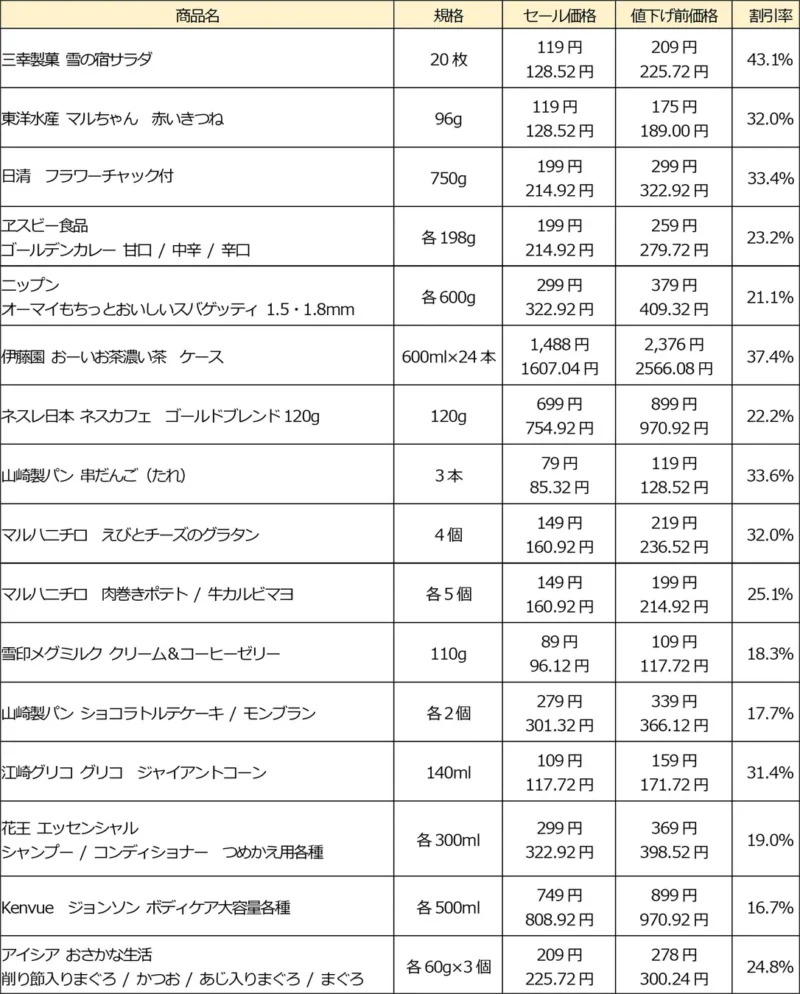 - 毎日の生活に必要な食品や日用品を単品値下げ 食品・日用品は約590品目を対象に値下げいたします。平均の値下げ率は22.1 %、最大値下げ率は43.1%となります。また生鮮品は、日替わりの特売商品をはじめ魅力的な価格で提供し、お買い得価格を提供いたします。