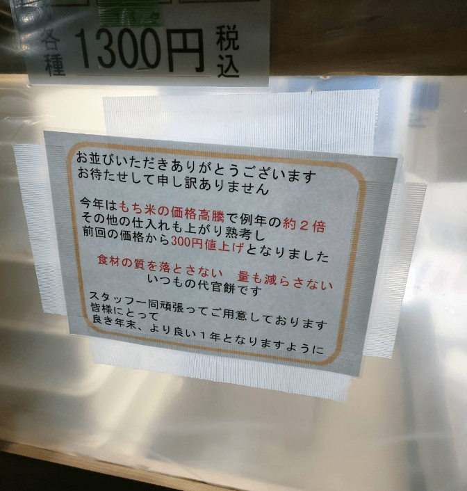 価格は、材料費の値上がりにより、例年1000円(税込み)のところ、今回は1300円(税込み)になっています。