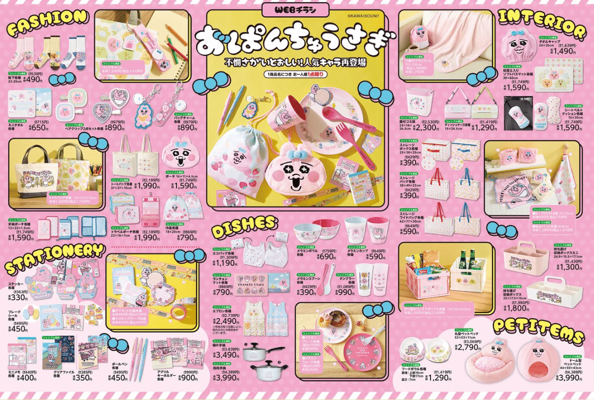 しまむら系列シャンブルでは『おぱんちゅうさぎ』大型コラボを2025年9月13日(土)~発売します。アパレル、チャーム、ポーチ、食器などの雑貨が種類豊富にラインナップします!