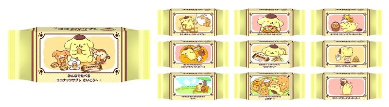 「ポムポムプリン」の大好物である“プリン”をイメージした「ココナッツサブレ プリン味」は、カスタード風味の生地にカラメルパウダーを練り込み、ふんわりとした甘さとコクのある味わいに仕上げました。パッケージには、特別に描き下ろした「ポムポムプリンとお友だち」をあしらいました。また、小分け包装では、「サブレでひとやすみ」をテーマにしたオリジナルストーリー (全10種類) を展開します。