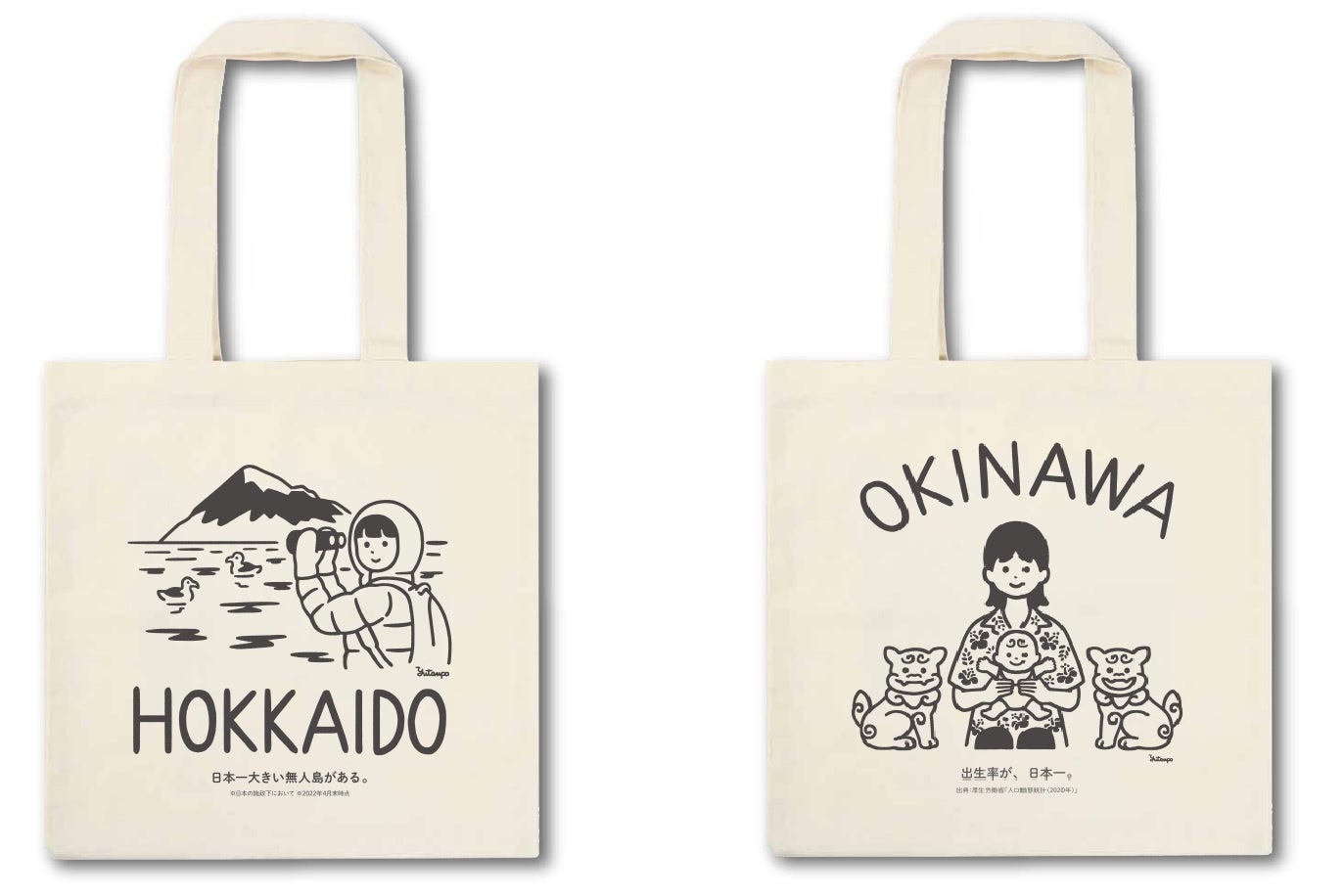 「地元をもっと好きになる」をコンセプトにした全47種類のトートバックです。シンプルでポップなイラストが特徴のイラストレーター白根ゆたんぽさんを起用し、日本一大きい無人島がある北海道、出生率が日本一の沖縄など、各地域のトリビアをデザインしています。