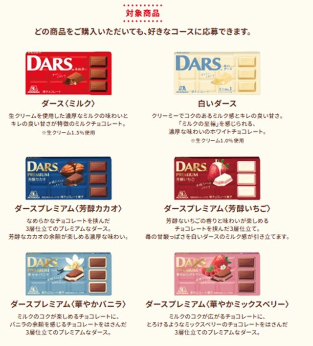 対象商品:「ダース<ミルク>」、「白いダース」、「ダースプレミアム<芳醇カカオ>」、「ダースプレミアム<芳醇いちご >」、「ダースプレミアム<華やかバニラ>」、「ダースプレミアム<華やかミックスベリー>」