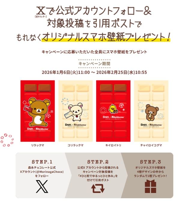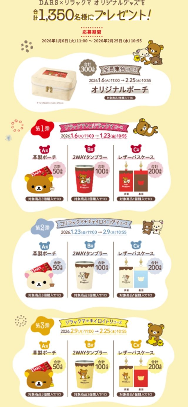 森永チョコレートDARS(ダース)では、2026年1月から『リラックマ』コラボのキャンペーンを開催します!対象商品を購入すると店頭でもらえる限定ノベルティなども展開です!