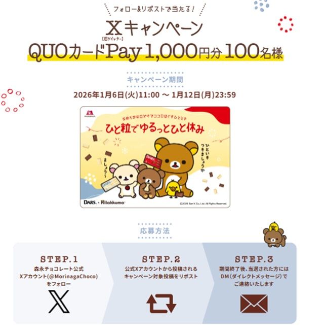 X(旧ツイッター)で森永チョコレート公式アカウント(@MorinagaChoco)をフォローして該当のポストをリポストすると、抽選で100名様にオリジナルデザインのQUOカードPay1,000円分が当たるキャンペーンを実施いたします。