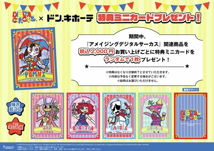 『アメイジングデジタルサーカス』関連商品を2,000円(税込)お買い上げごとに特典ミニカード(全5種)をランダムで1枚プレゼント。